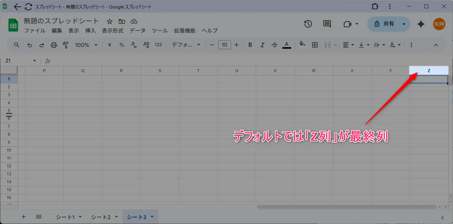 たとえば、スプレッドシートのデフォルトの最終列はZ列(26列)です