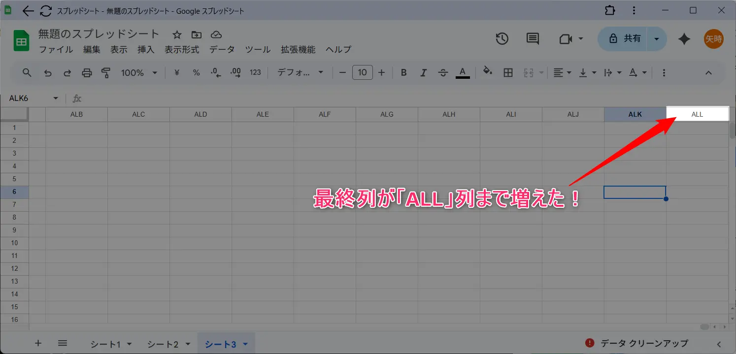 この方法はスプレッドシートの100列など「たくさん」増やすときにも応用可能ですが、一気に増やしすぎると画面が横に伸びすぎて状況が分かりにくくなります。