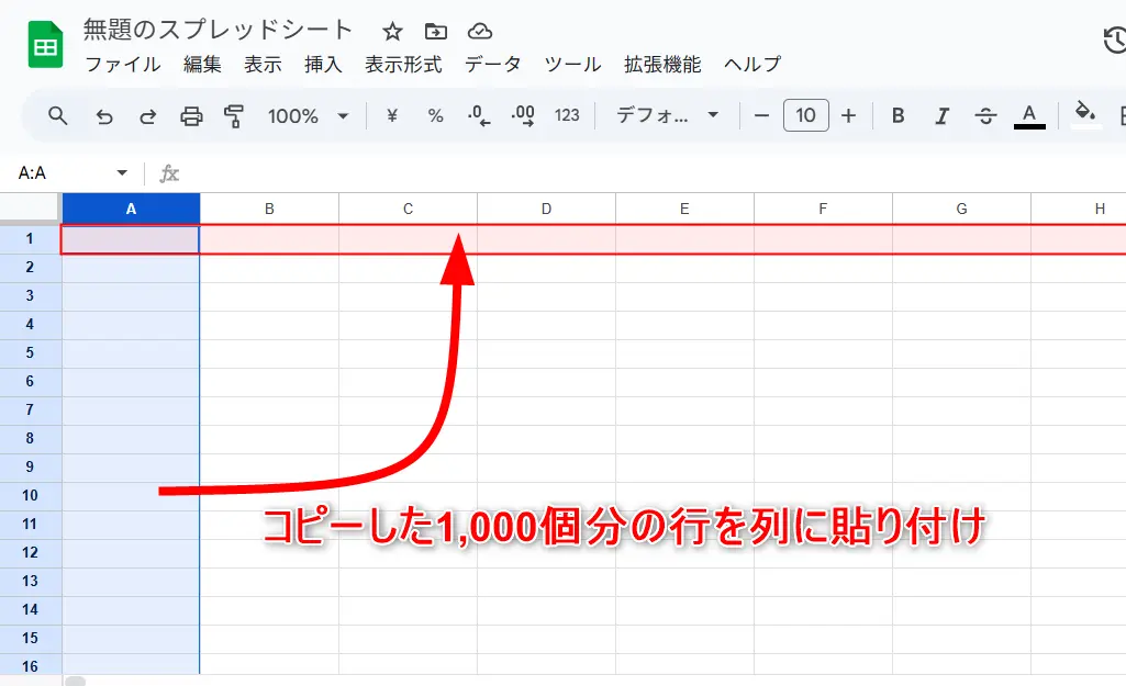 なぜ転置して貼り付けでこんなことができるかというと、コピーしたA列全体(1,000行)を1行目に貼り付けているからです。