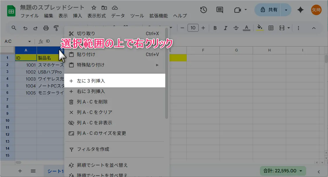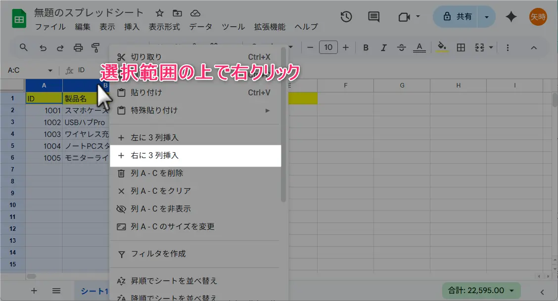 列番号(A、B、C…)をクリックして列全体を選択し、右クリック →「左にn列を挿入」または「右にn列を挿入」を選べば、狙った位置にスッと増やせます。