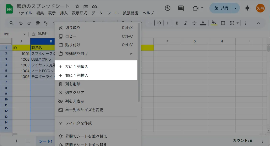追加したい列を選び、右クリック →「左に1列挿入」または「右に1列挿入」を選択すれば完了。