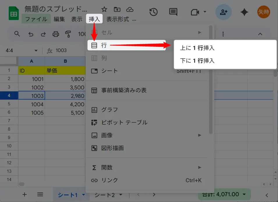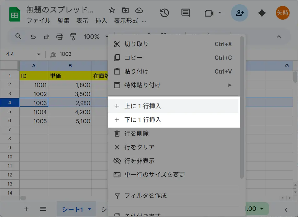 上に1行挿入または下に1行挿入を選択すると、スプレッドシートの行を増やすことができます。
