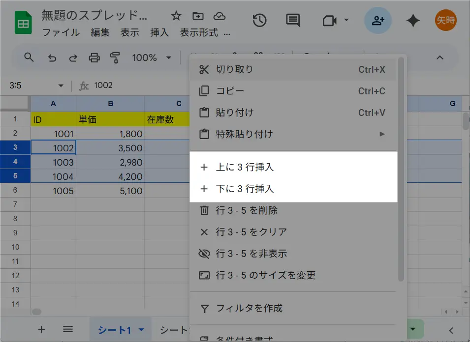 その後、右クリックして上に3行挿入または下に3行挿入を選択すると、スプレッドシートの行を増やすことができます。