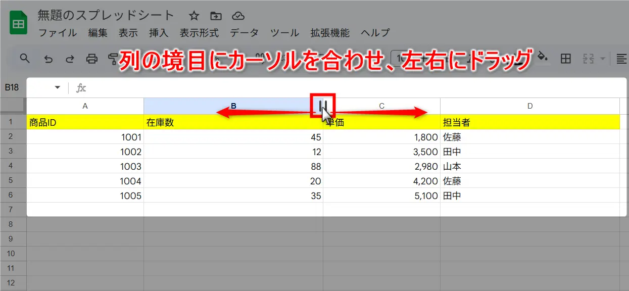 列見出し(A・B・C など)の境目にカーソルを合わせ、左右にドラッグすることで列幅を調整できます。