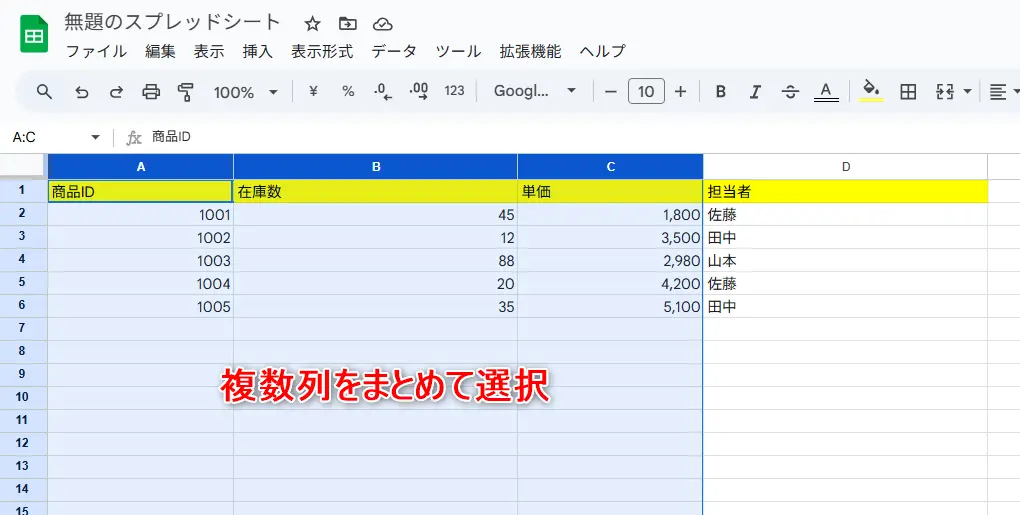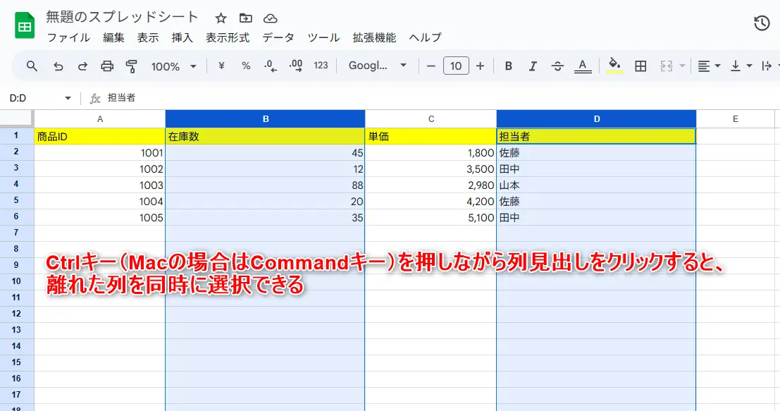 Ctrlキー(Macの場合はCommandキー)を押しながら列見出しをクリックして複数の列を選択します。