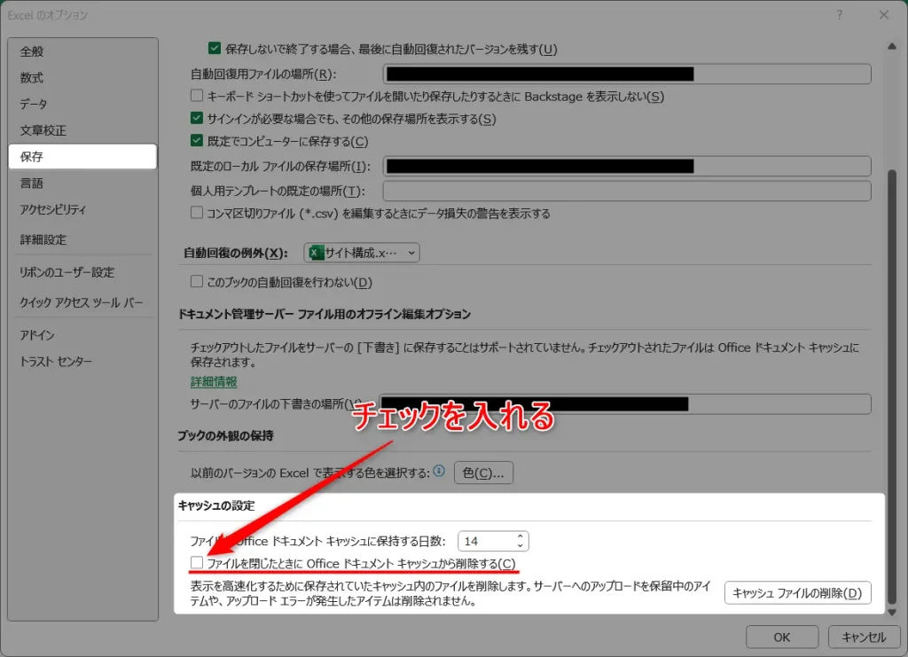 にチェックを入れると、ファイルを閉じた段階で古いキャッシュも同時に消えるため、常に最新の状態で作業を再開できます。