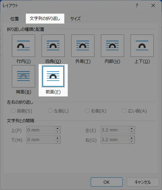 そこで、文字列の折返しタブの中の前面を選択してOKボタンを押してください。